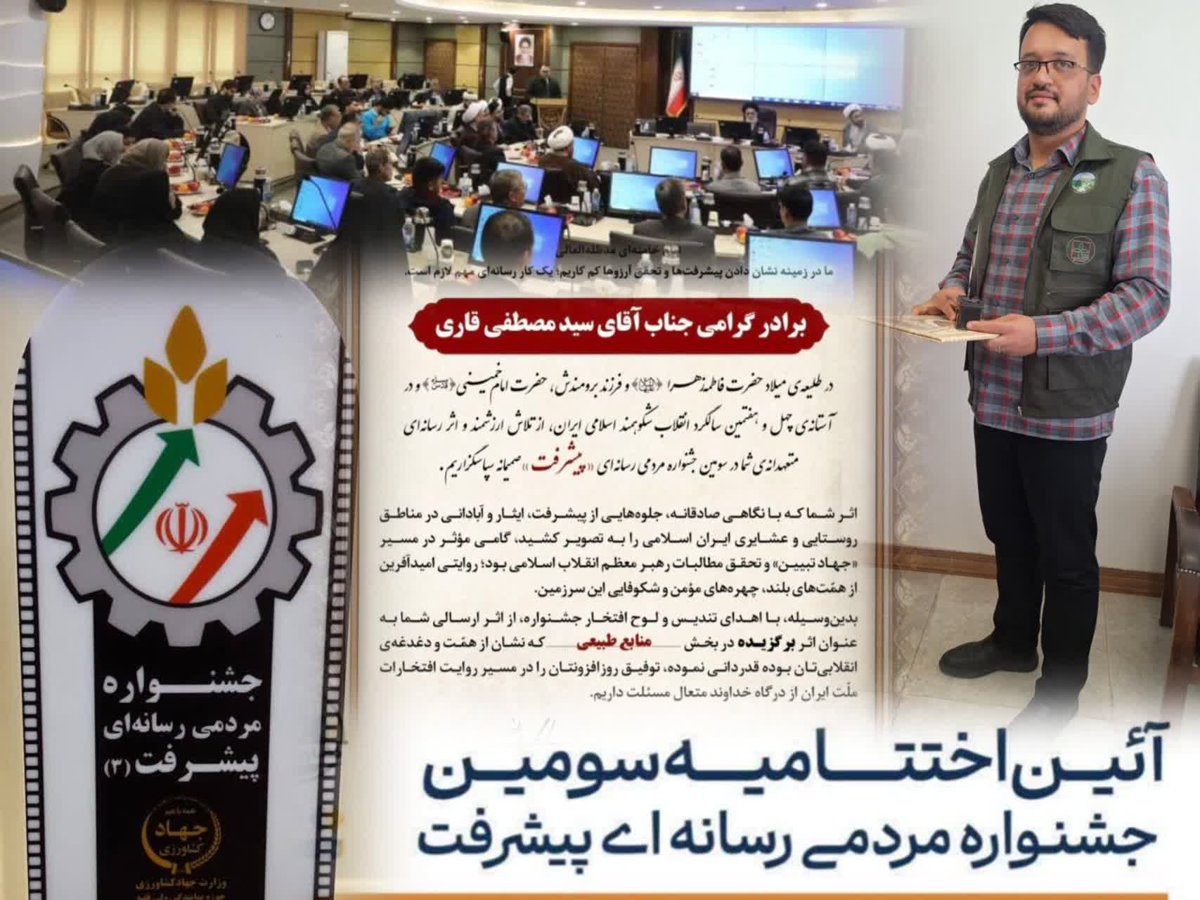 به گزارش عصر تبیین، در سومین دوره جشنواره رسانهای پیشرفت، مستندهای تولیدی مهندس سیدمصطفی قاری، مجری شبکه استانی همدان و کارشناس روابط عمومی اداره کل منابع طبیعی و آبخیزداری استان، بهعنوان اثر برگزیده بخش فیلم معرفی شد.